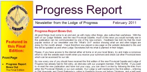Newsletters: From this page you can view the FINAL edition of our “Progress Report” Newsletter. Progress Report – FINAL EDITION Click the Link Below to view Progress Report – February 2011 FINAL EDITION Click the links below to view previous issues Older editions of our newsletter will remain on this site for at least six months. Progress Report January 2011 Progress Report – December 2010 Progress Report – November 2010 Progress Report October 2010 Progress Report: September 2010. Progress Report: June 2010. Progress Report: May 2010. Progress Report: April 2010. Progress Report: March 2010